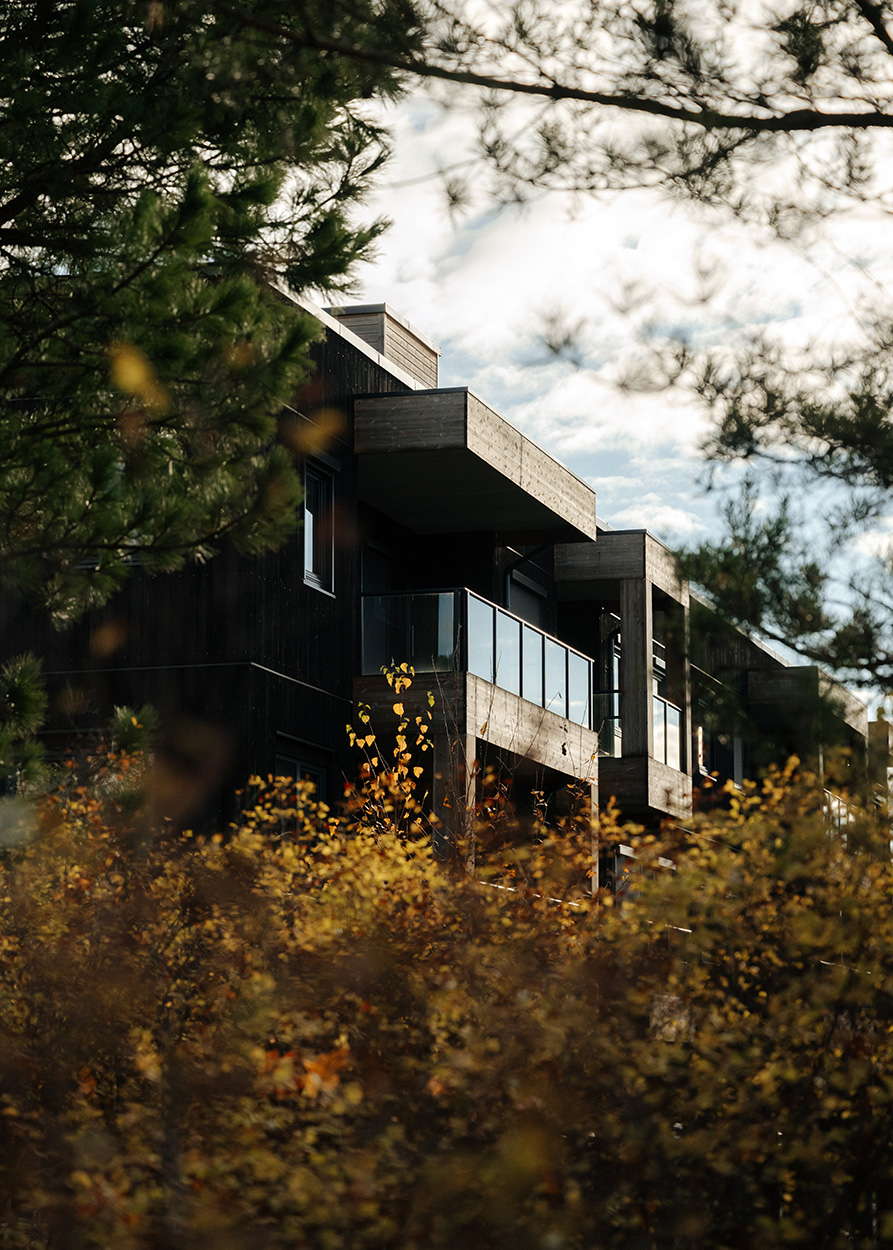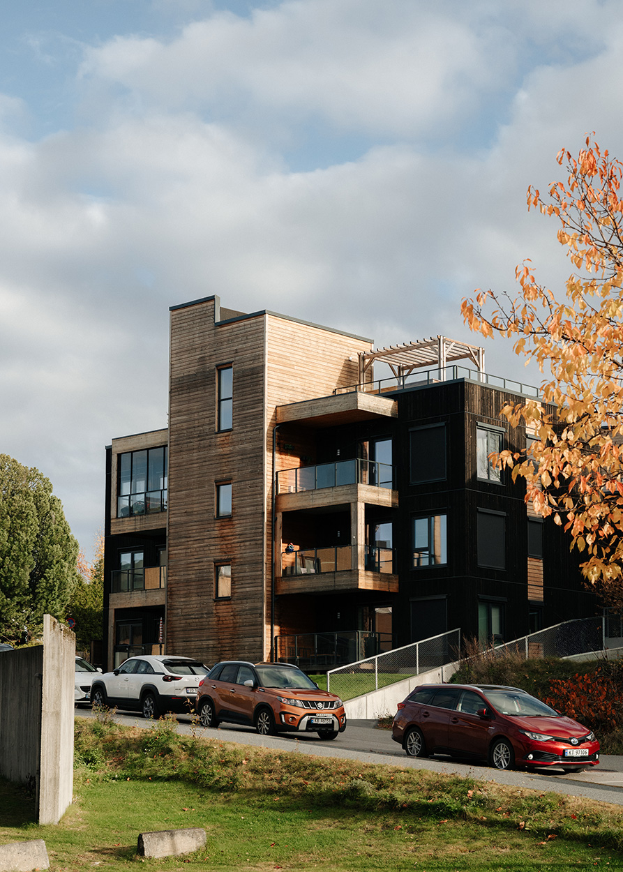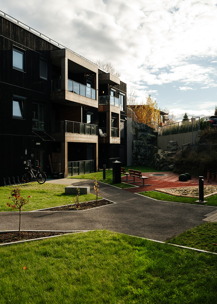 Leilighetene er oppført i to lavblokker over tre etasjer, organisert rundt et felles uterom. Gangvegen som slynger seg gjennom uterommet, rammer inn ulike soner for uteopphold, samtidig som den gir universelt tilgjengelig adkomst. Uterommet har variert beplantning, med gress, trær, busker og stauder, og rommer både lekeplass og flere sittemuligheter som inviterer til opphold og møter mellom beboerne.