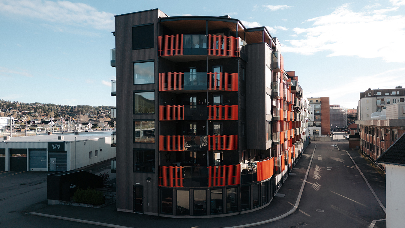 Nye leilighetsbygg over seks etasjer med parkering i kjeller, kontorer og boder i 1. etasje, og leiligheter i etasjene over.