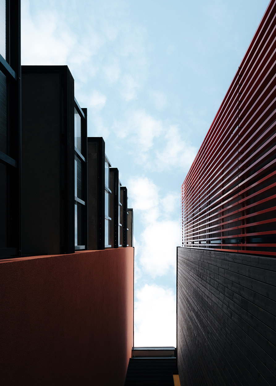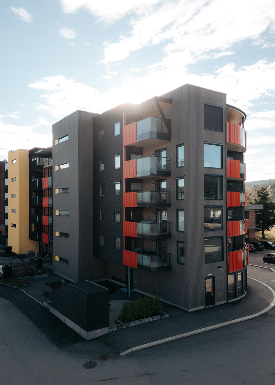 Balkonger har rekkverk med stående lakkerte spiler, som tar opp hovedfarge fra nabobygg S9.